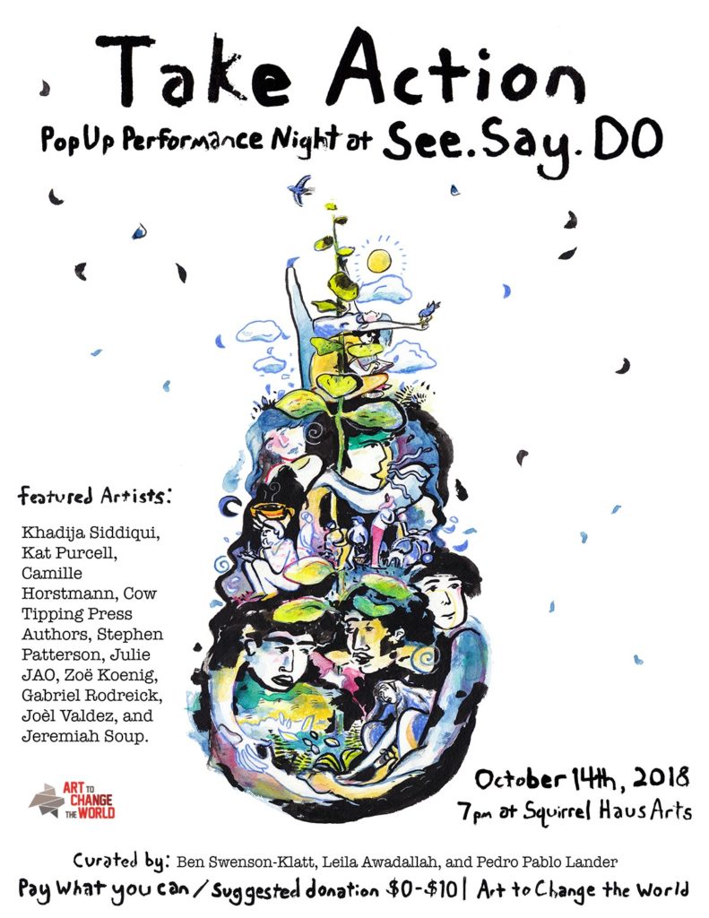 Join Art to Change the World on October 14th for Take Action – Pop Up Performance Night at See. Say. DO. This event centers around artists exploring challenging topics through their mediums as a vehicle for positive change. Featuring ten artists, this night will highlight interdisciplinary performance work from a diverse group of local artists with an aim toward provoking audiences to take action.