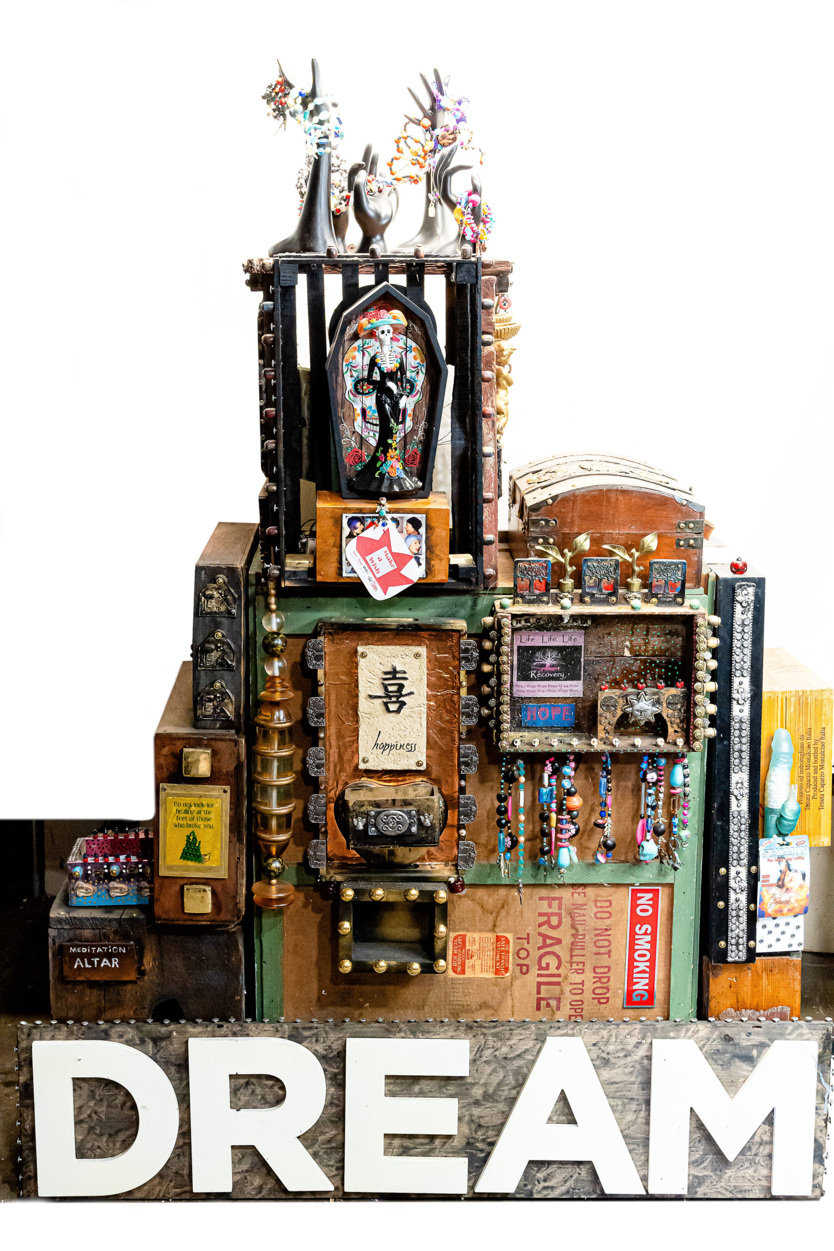 Barbara employs art to deliver a message of hope and serve as a catalyst for positive social change. Workshop participants open all the cupboards and drawers, consider what they saw and select a power object to keep. They leave their reflections and comments in Esperanza’s (Hope’s) backpack.