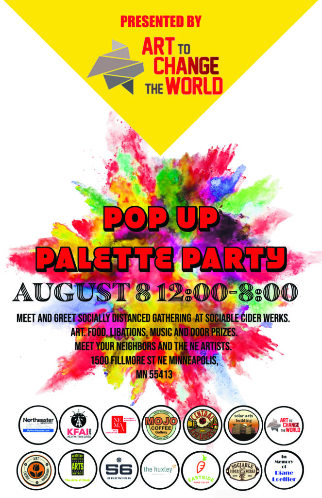 August 8 Sociable Cider Works Exhibition Pop Up Palette Party and Show. Arrive at 9:00 to set up. Breakdown and clean up at 8:00. 1500 Fillmore St NE Minneapolis, MN