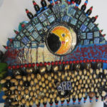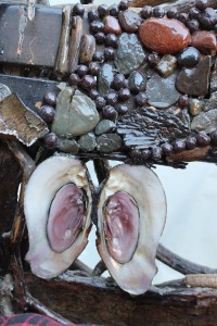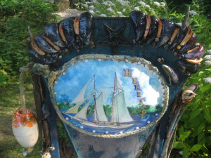 22″ W X 2 2″ W X 48″ T Mixed Media Canvas, rescued chair, shells, rope, buoy, hand hooked pillow 2011