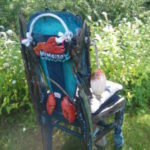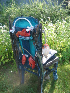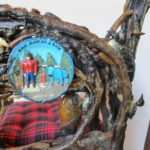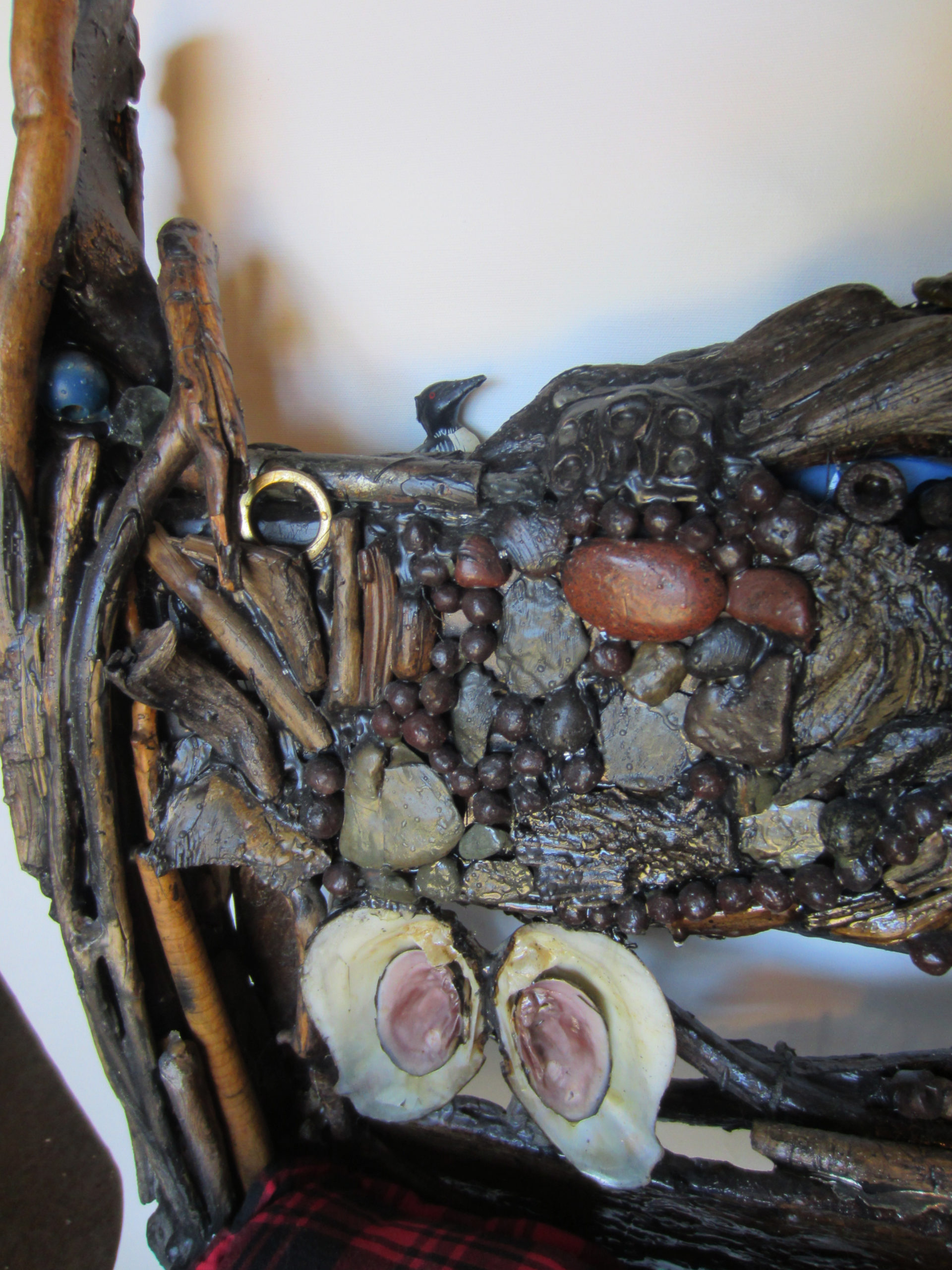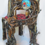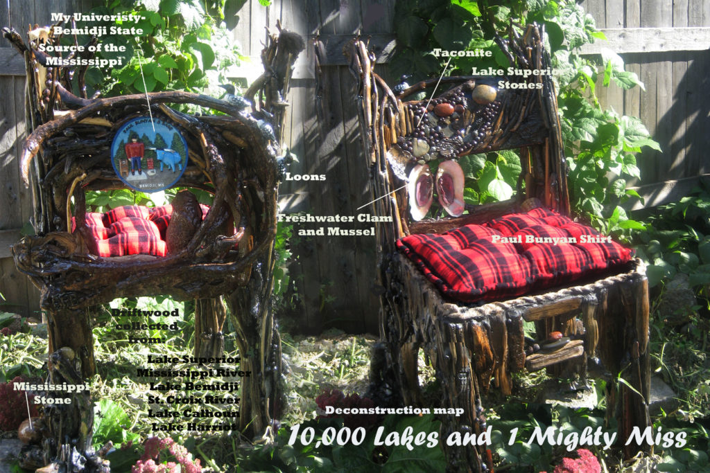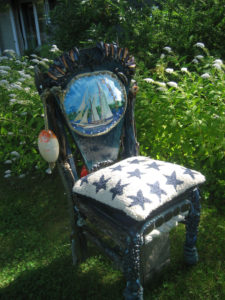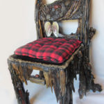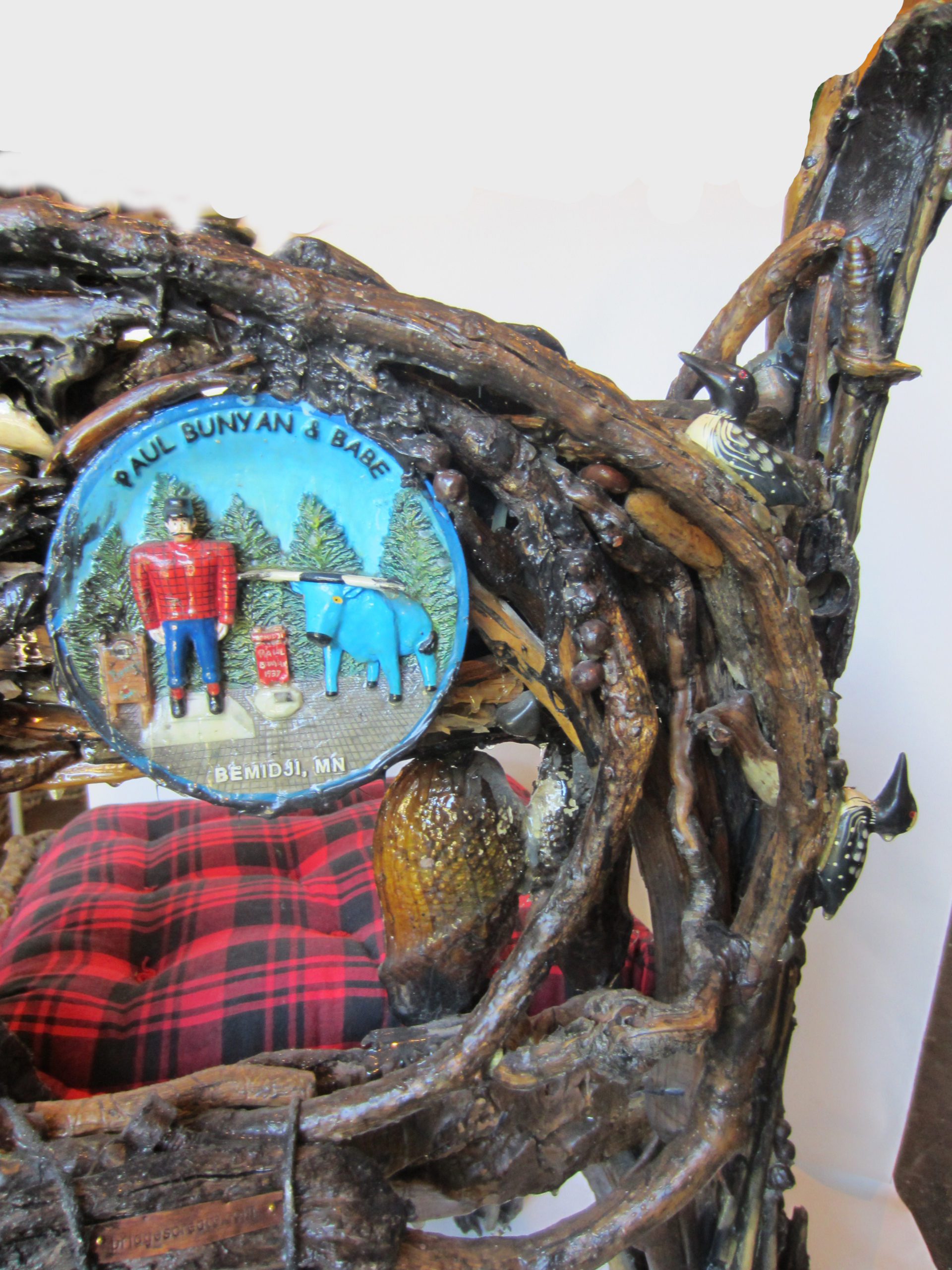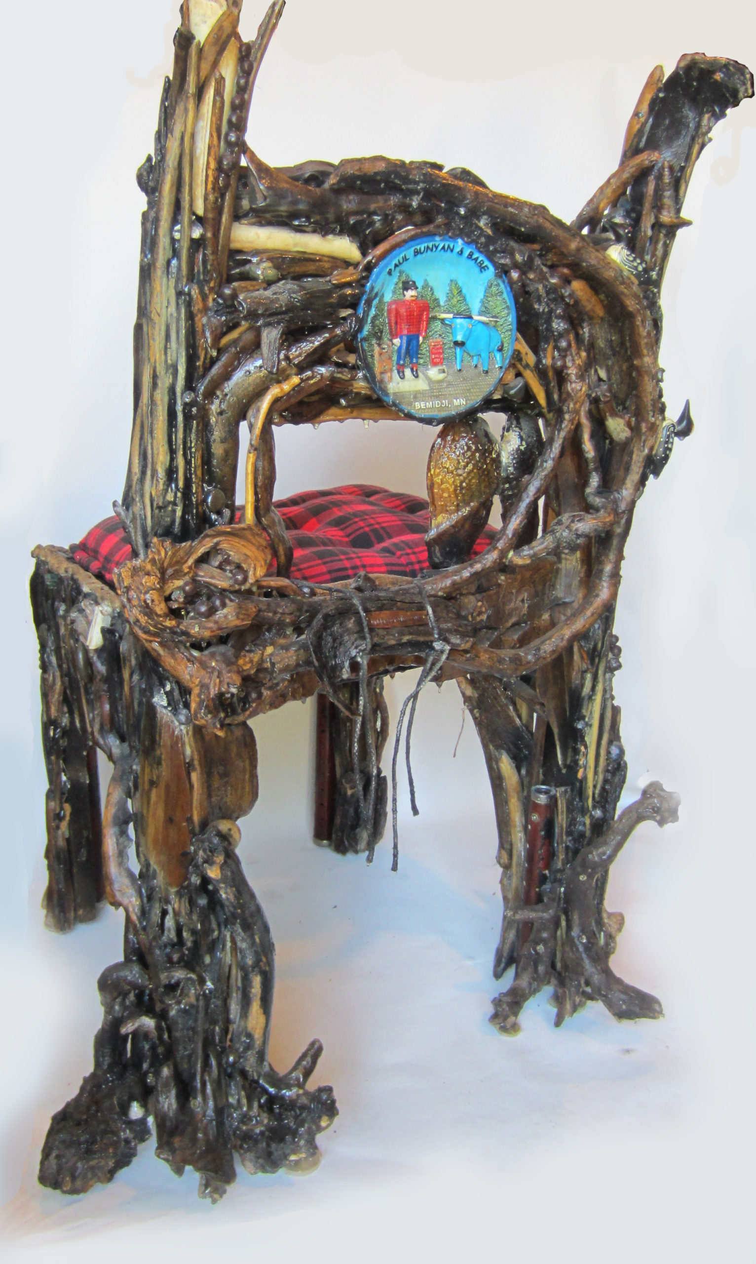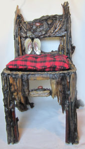 26″ W X 48″ T X 28″ D Mixed Media, Rescued chair, drift wood, zebra mussel, taconite, Paul Bunyan plate, plaid fabric