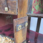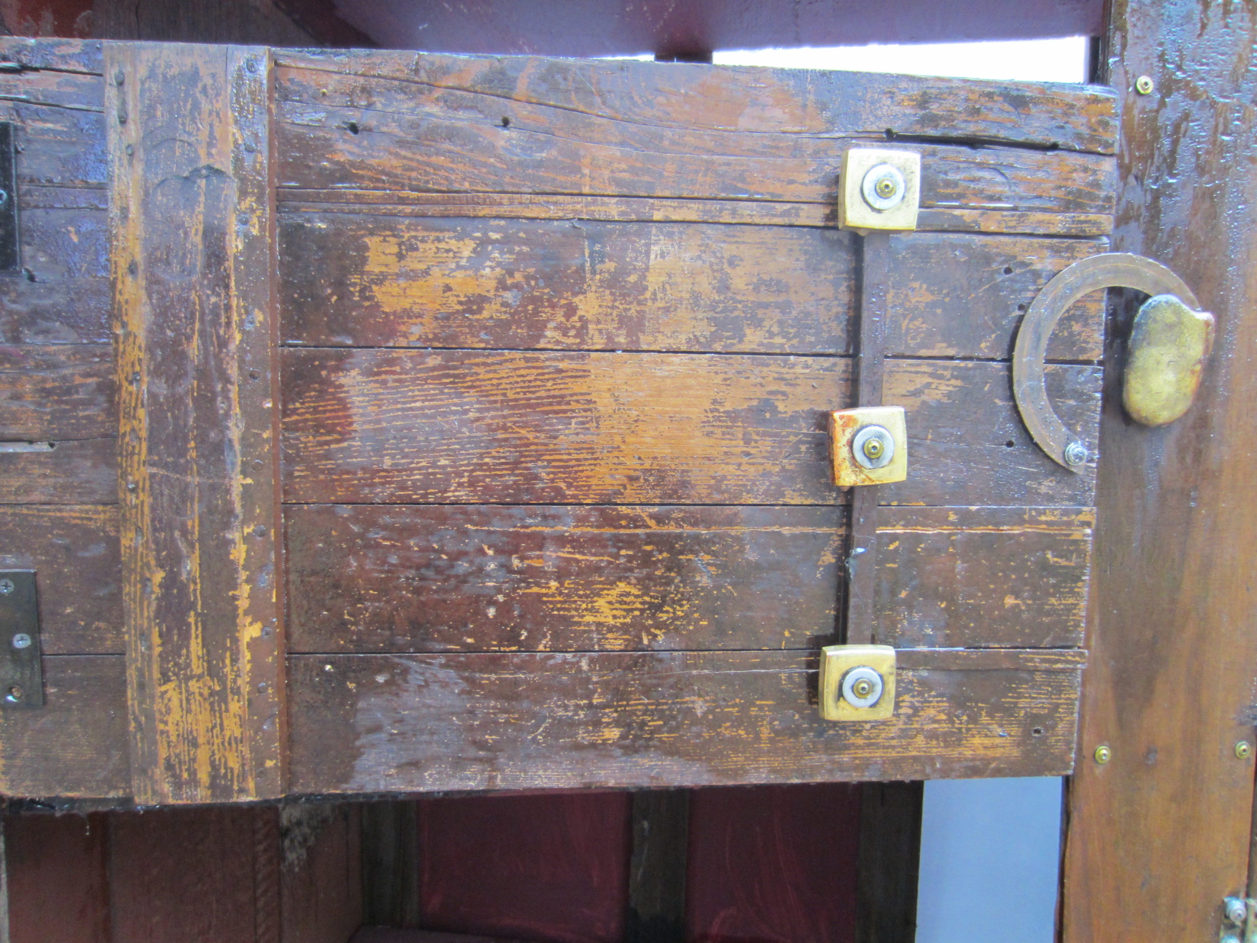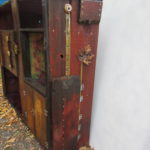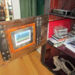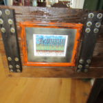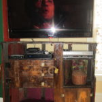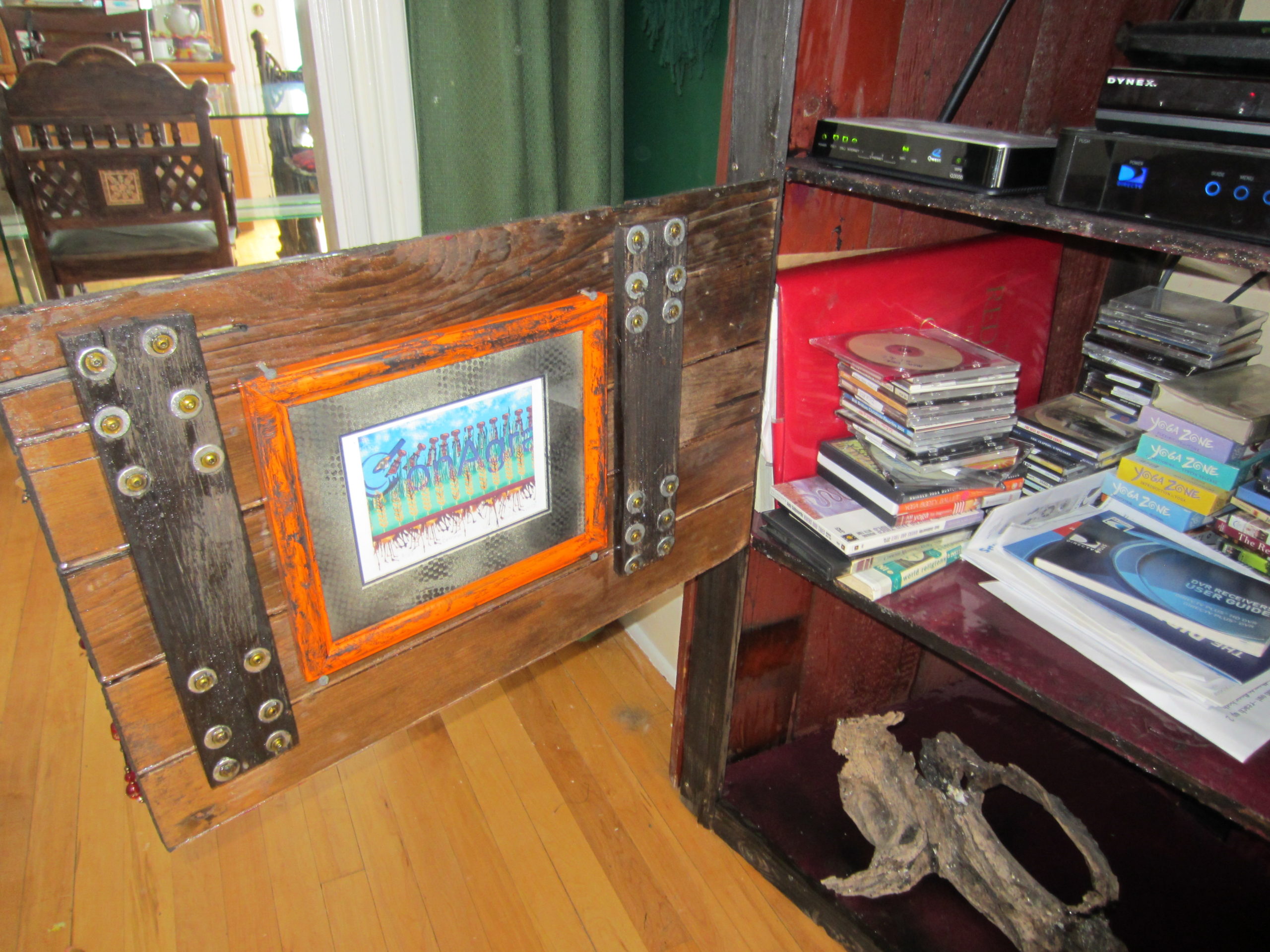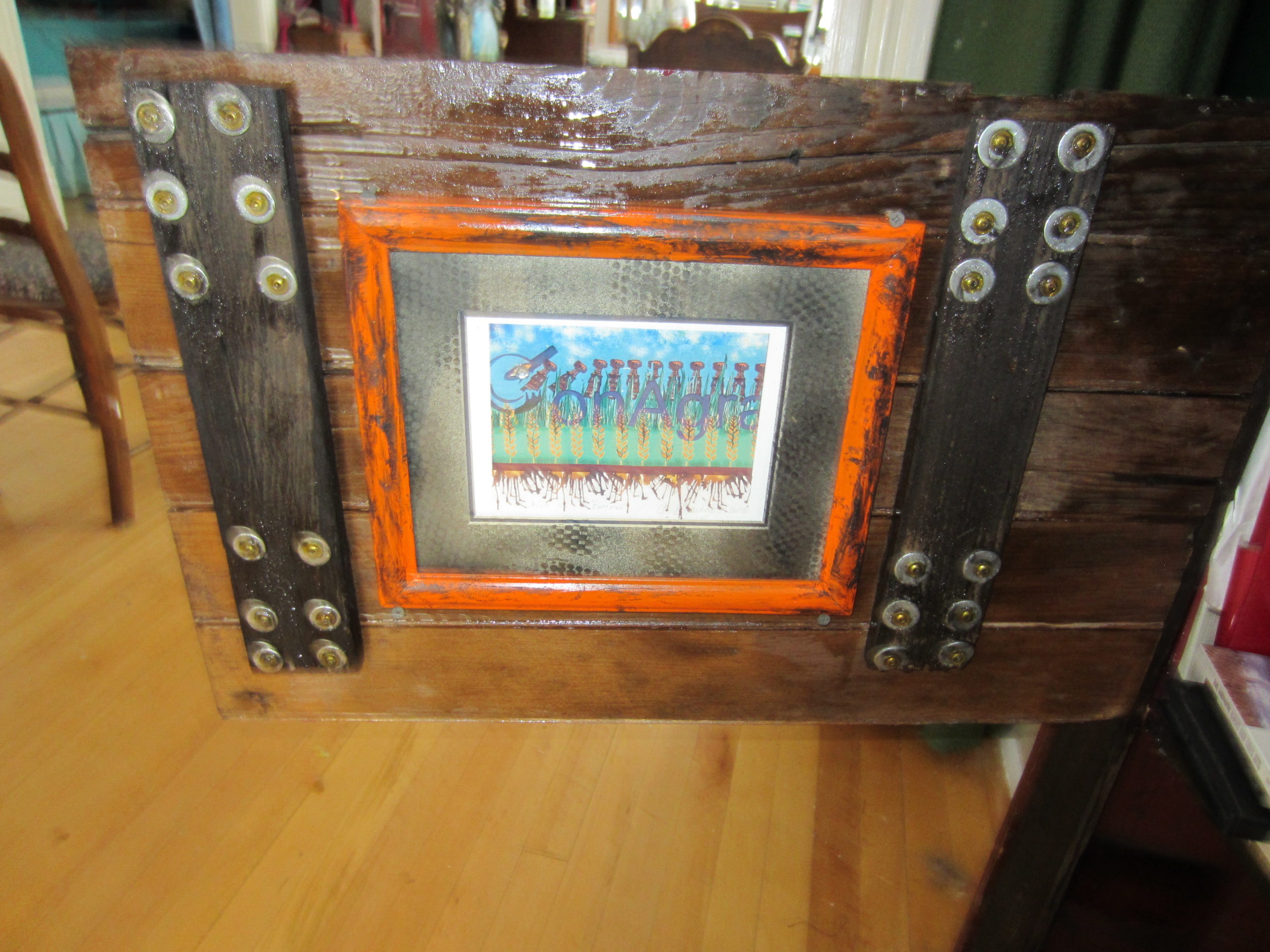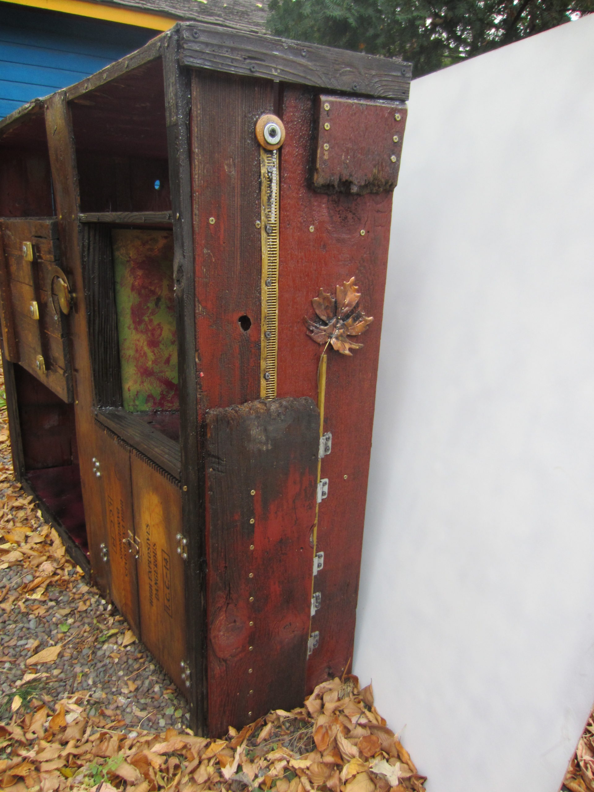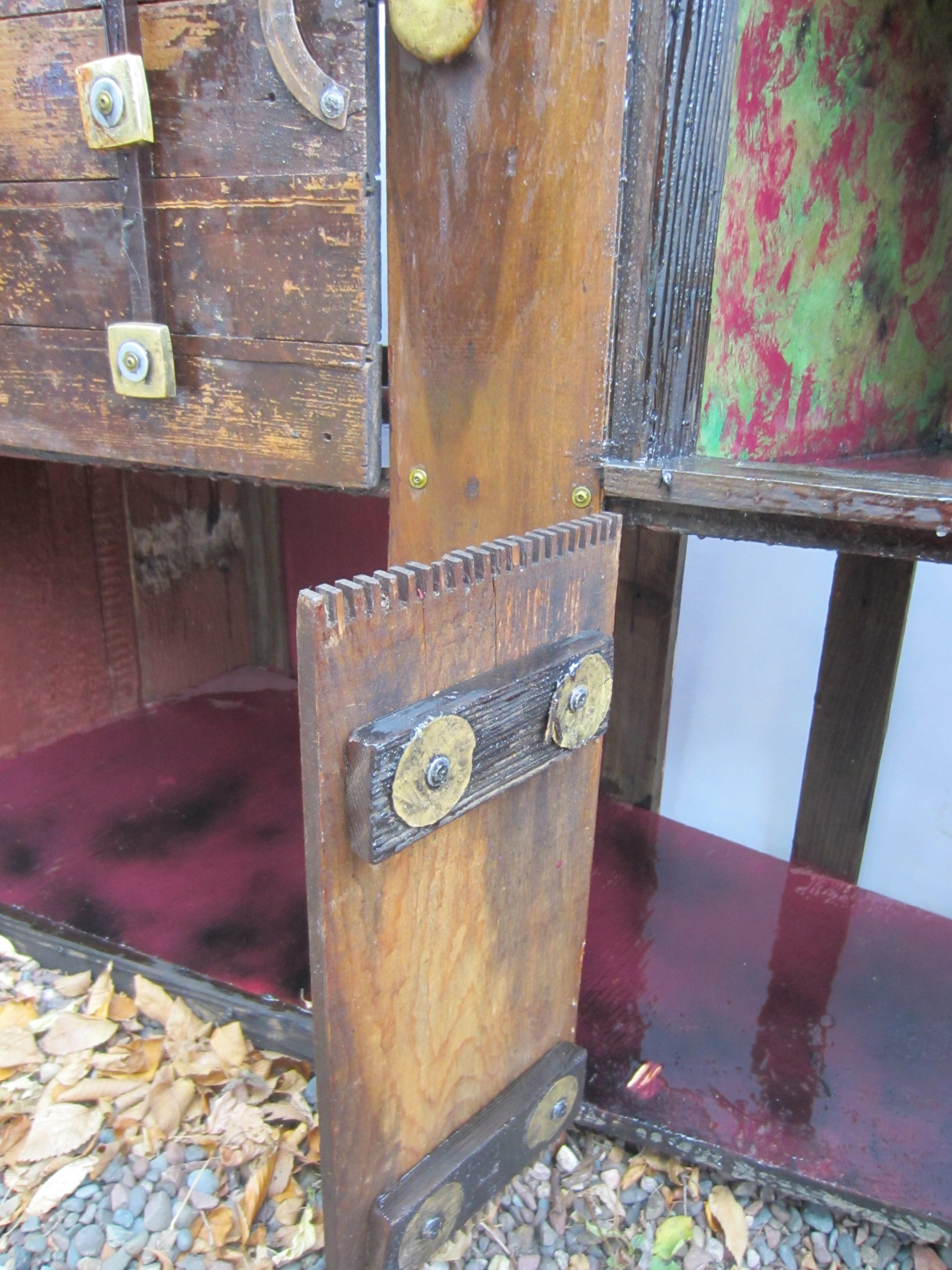 This cabinet was designed for a difficult under screen triangle corner and was created using rescued objects from the streets of Minneapolis, wooden dynamite boxes, stained glass, Kohler brass, 130 year old aged fence wood and architectural salvage warehouses. The carpentry is very skilled and finished and all is sealed in matte boat epoxy for durability and a clean non-shedding surface. Many one-of-a-kind details including original art work. I am eager to use YOUR objects for a custom made art work. .Many one-of-a-kind details including limited edition print Con Man Print