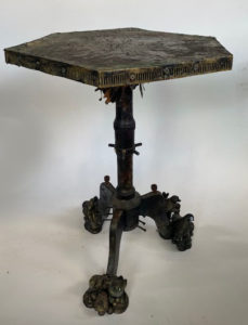 The furniture created in the studio has a steam punk look to it. Although sticking to very formal elements and principals of design, the stand appears to have been created by objects found in an abandoned home. Some were.