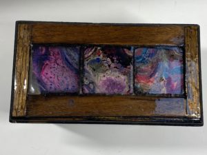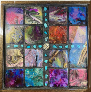 Pour tiles and Re-cycled wood. Sealed with epoxy